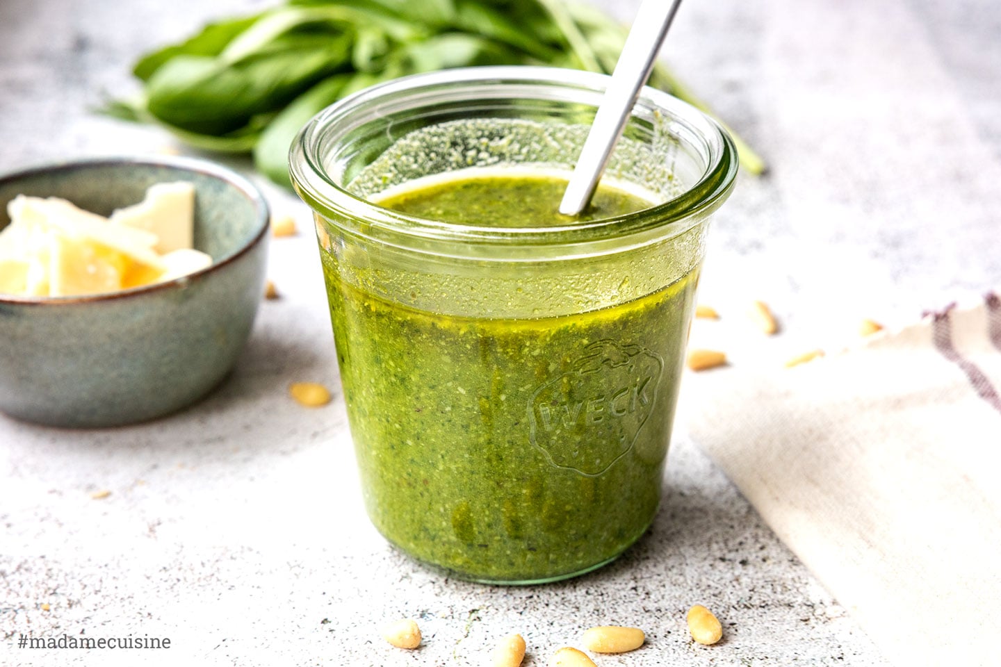 Parmesankäse: In der klassischen Rezeptur aus Genua werden häufig zwei Käsesorten kombiniert, um Cremigkeit und Würze auszubalancieren. Der Parmigiano Reggiano bringt eine feine, nussige Note mit, der Pecorino sorgt hingegen für mehr Kraft und leichte Schärfe. Alternativ lässt sich das Basilikum-Pesto auch mit nur einer der beiden Sorten - oder mit Grana Padano - zubereiten.