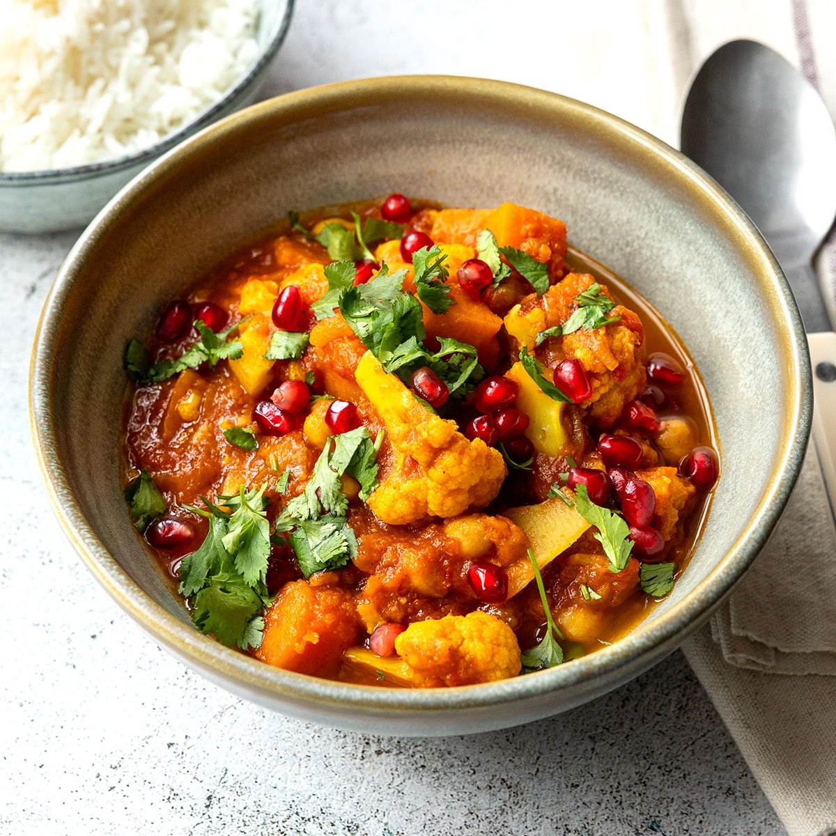 - Tajine auf Teller verteilen und mit frisch gehacktem Koriander und Granatapfelkernen bestreut servieren. Dazu schmeckt gekochter Basmati- oder Jasminreis.