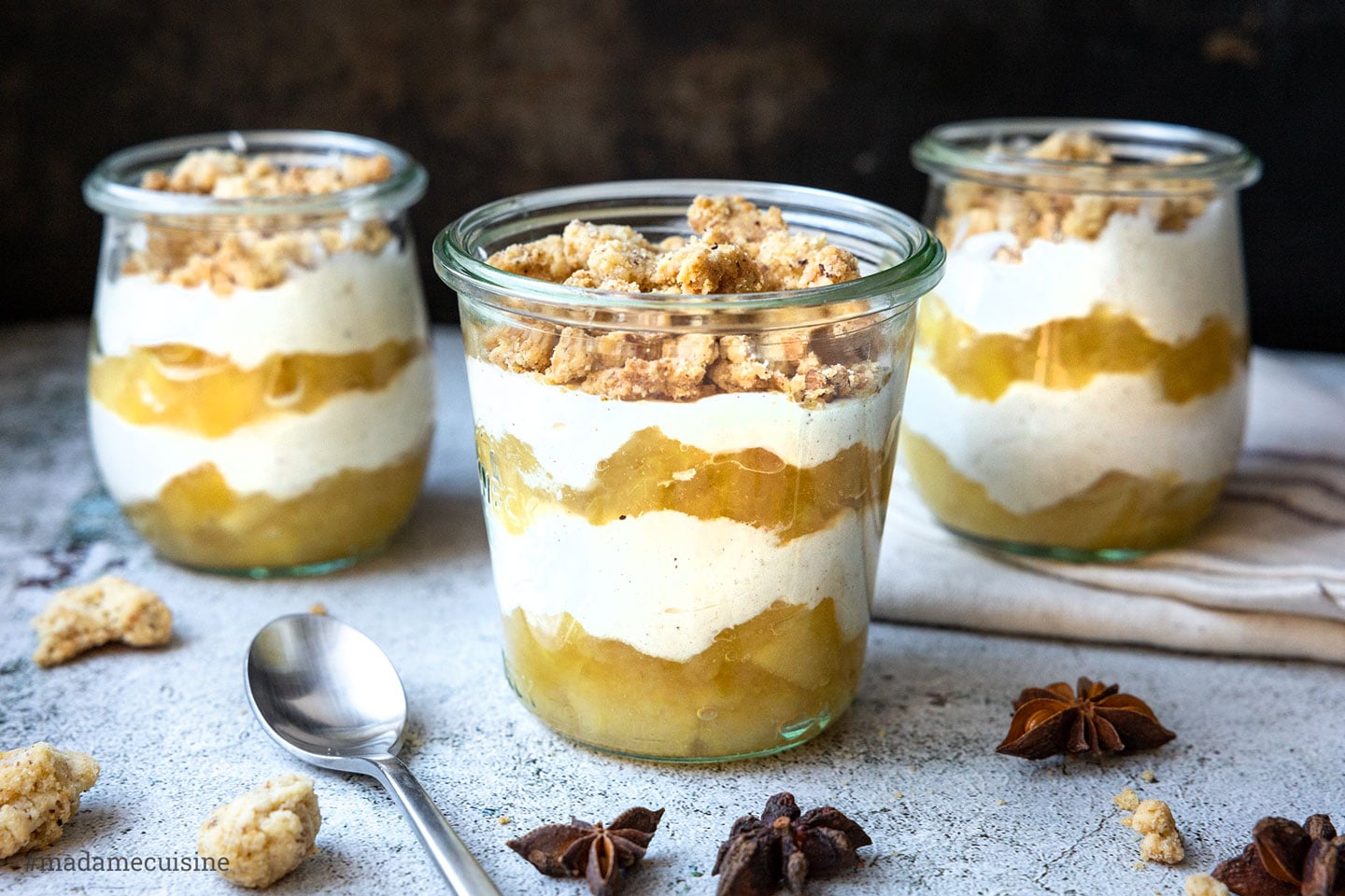 - Die Hälfte von dem Bratapfelkompott auf 4 Dessertgläser verteilen. Die Hälfte der Zimtcrème gleichmäßig darauf verteilen. Anschließend den Vorgang mit Bratapfelkompott und Zimtcrème wiederholen. Dessert mit den Streuseln abschließen.