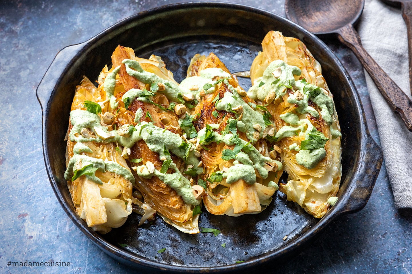Der Spitzkohl wird in Spalten geschnitten, mit einer Marinade aus Olivenöl, Honig, geräuchertem Paprikapulver und Kreuzkümmel eingepinselt und anschließend von beiden Seiten kräftig in der Pfanne angebraten. Kurz schmoren lassen und dann mit einer feinen Crème aus eingeweichten und pürierten Cashewkernen, etwas Zitronensaft und frischem Koriander servieren. Ich verspreche euch - ihr werdet Kohl nie wieder anders essen wollen!