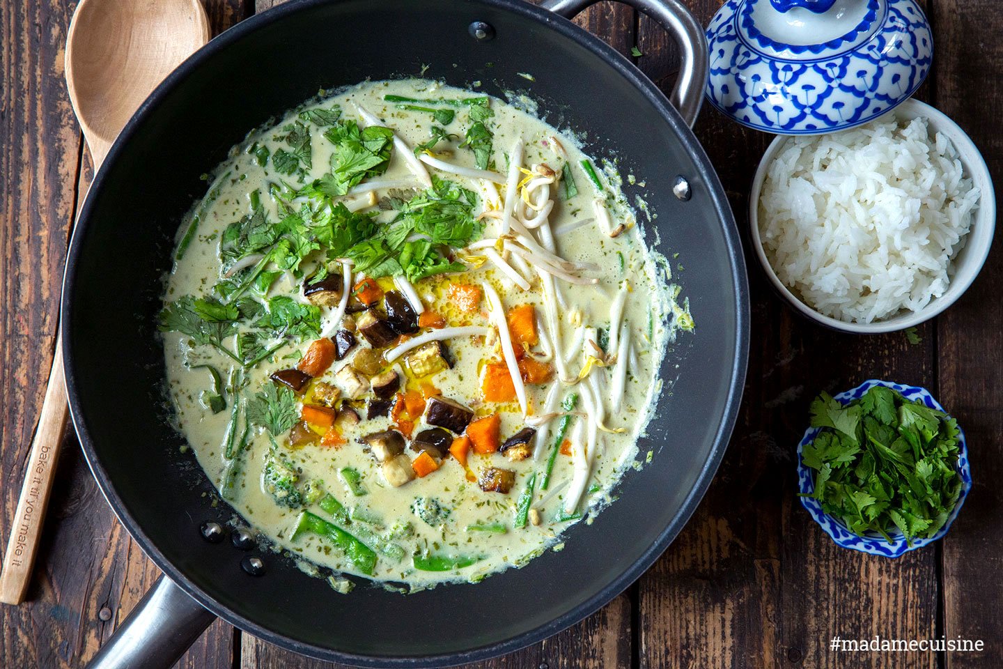 Dieses grüne Curry ist vegetarisch, und sogar vegan. Der besondere Pfiff kommt ins Rezept durch die im Ofen geschmorten Kürbis- und Auberginenwürfel. Durch das Schmoren entfalten sich die intensiven Röstaromen, und das Gemüse bekommt eine schöne Bissfestigkeit.