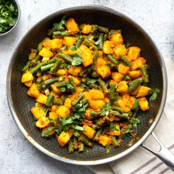 Diese Kartoffel-Bohnen-Pfanne bringt ordentlich Aroma in die Küche: Vorwiegend einfache Zutaten verwandeln sich mit Kurkuma, Kreuzkümmel und Koriander in ein wunderbar würziges Gericht mit leicht indischem bzw. pakistanischem Einschlag. Die Kombination aus vorgegarten Kartoffeln und Bohnen, die anschließend in der Pfanne angebraten werden, sorgt für eine perfekte Balance aus zart und knusprig.