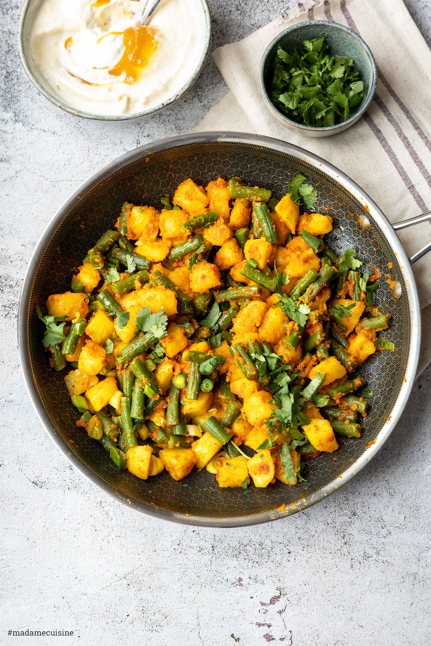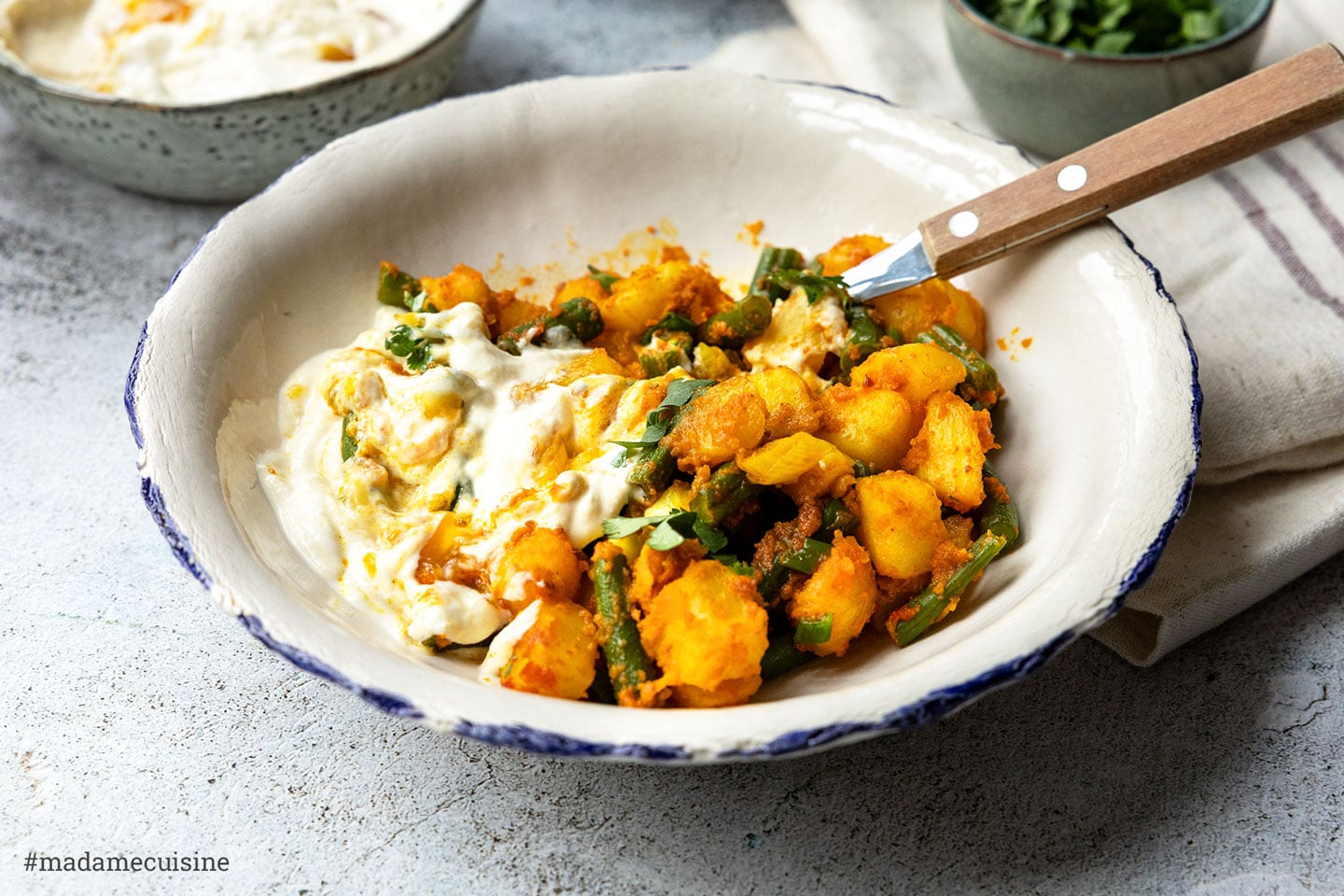 Ob als unkompliziertes vegetarisches Hauptgericht oder als Beilage zu einem größeren Menü – diese würzige Kartoffelpfanne mit Bohnen ist ein echtes Allround-Rezept. Besonders gut passt dazu ein frischer Joghurt-Dip mit Limette und Mango-Chutney, der dem Gericht eine fruchtige Frische verleiht.