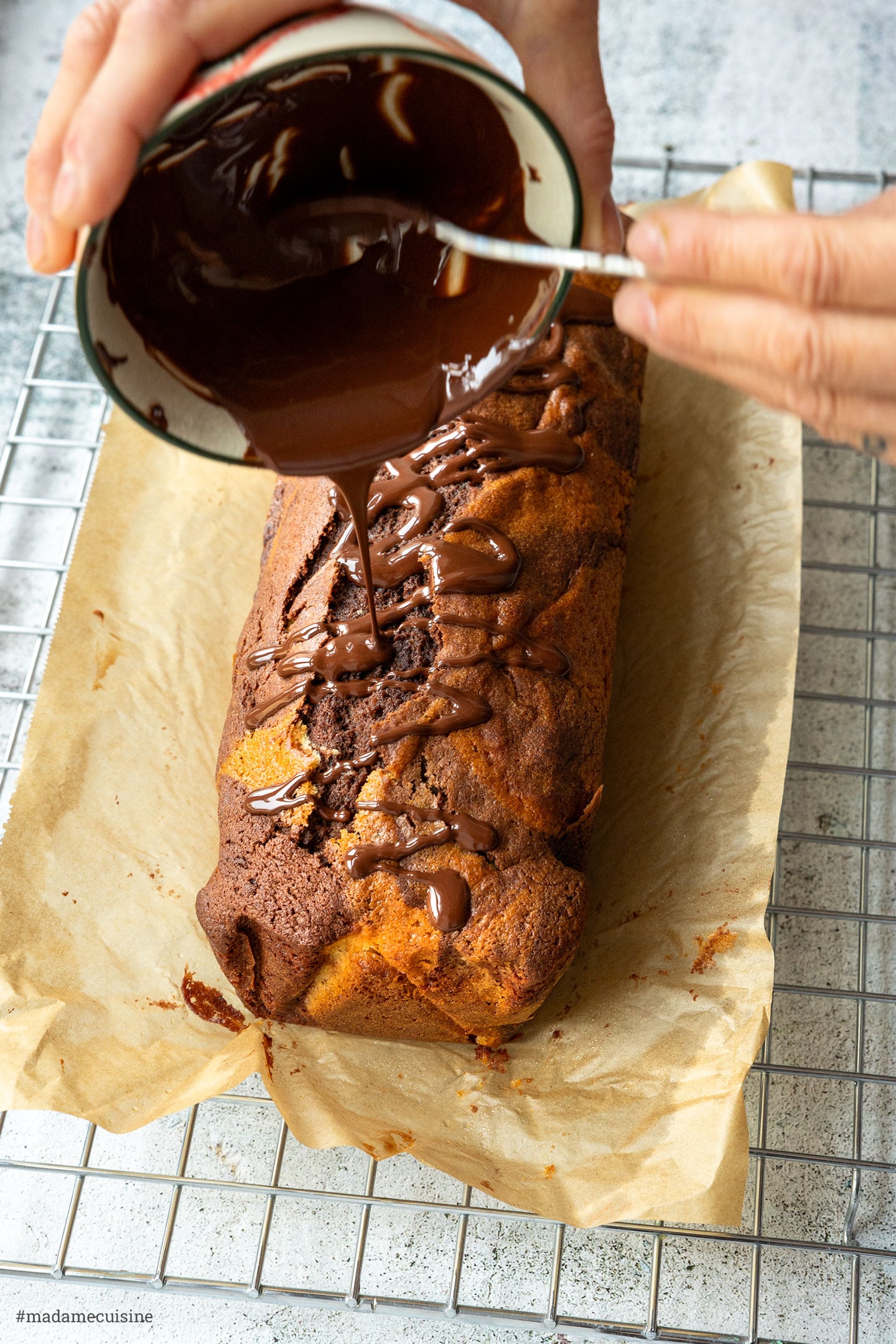 - Den hellen und den dunklen Teig abwechselnd in die vorbereitete Backform füllen und mit einer Gabel spiralförmig durchziehen. Kuchen in der Mitte des vorgeheizten Ofens ca. 55-60 Min. backen. Gegen Ende der Garzeit ggf. mit etwas Backpapier oder Alufolie abdecken, damit der Kuchen nicht zu dunkel wird. Mit einem Stäbchen einstechen, um zu sehen, ob der Kuchen fertig gebacken ist.
