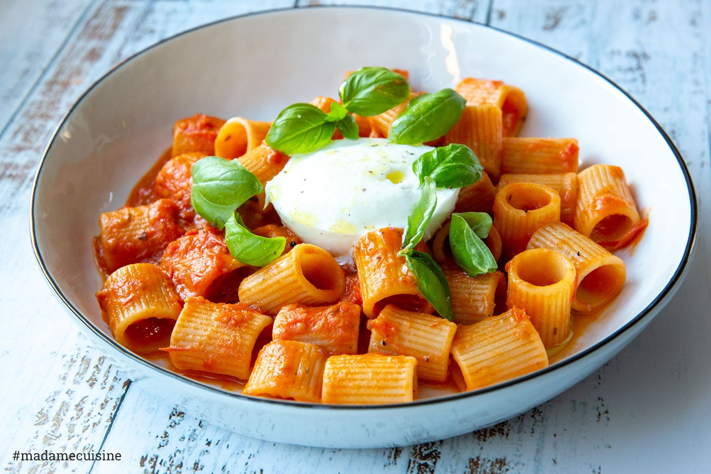 - Basilikum waschen und trocken schütteln, die Blättchen abzupfen. Den Burrata halbieren. Pasta auf zwei Teller verteilen und mit je einer halben Kugel Burrata, sowie ein paar frischen Basilikumblättchen anrichten. Vor dem Servieren noch ein wenig gutes Olivenöl darüberträufeln.