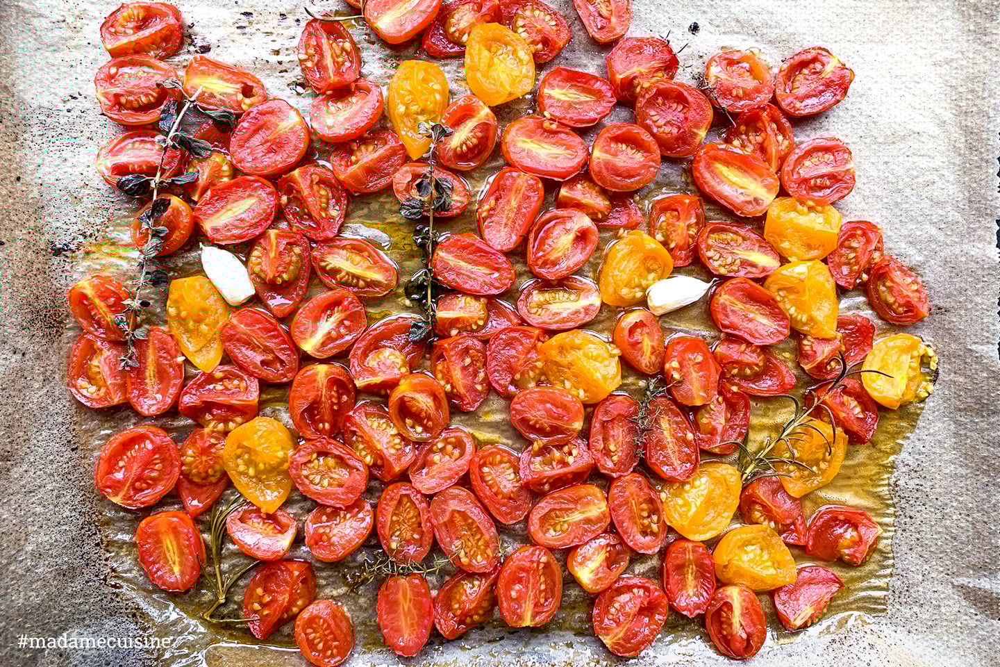Ich würde tatsächlich Dosentomaten kaufen. Da gibt es z.B. auch Datterini-Tomaten aus der Dose. Im Ofen rösten braucht du diese nicht, aber ich würde sie zusammen mit den Gewürzen auf dem Herd bei kleiner Hitze etwas länger einkochen.