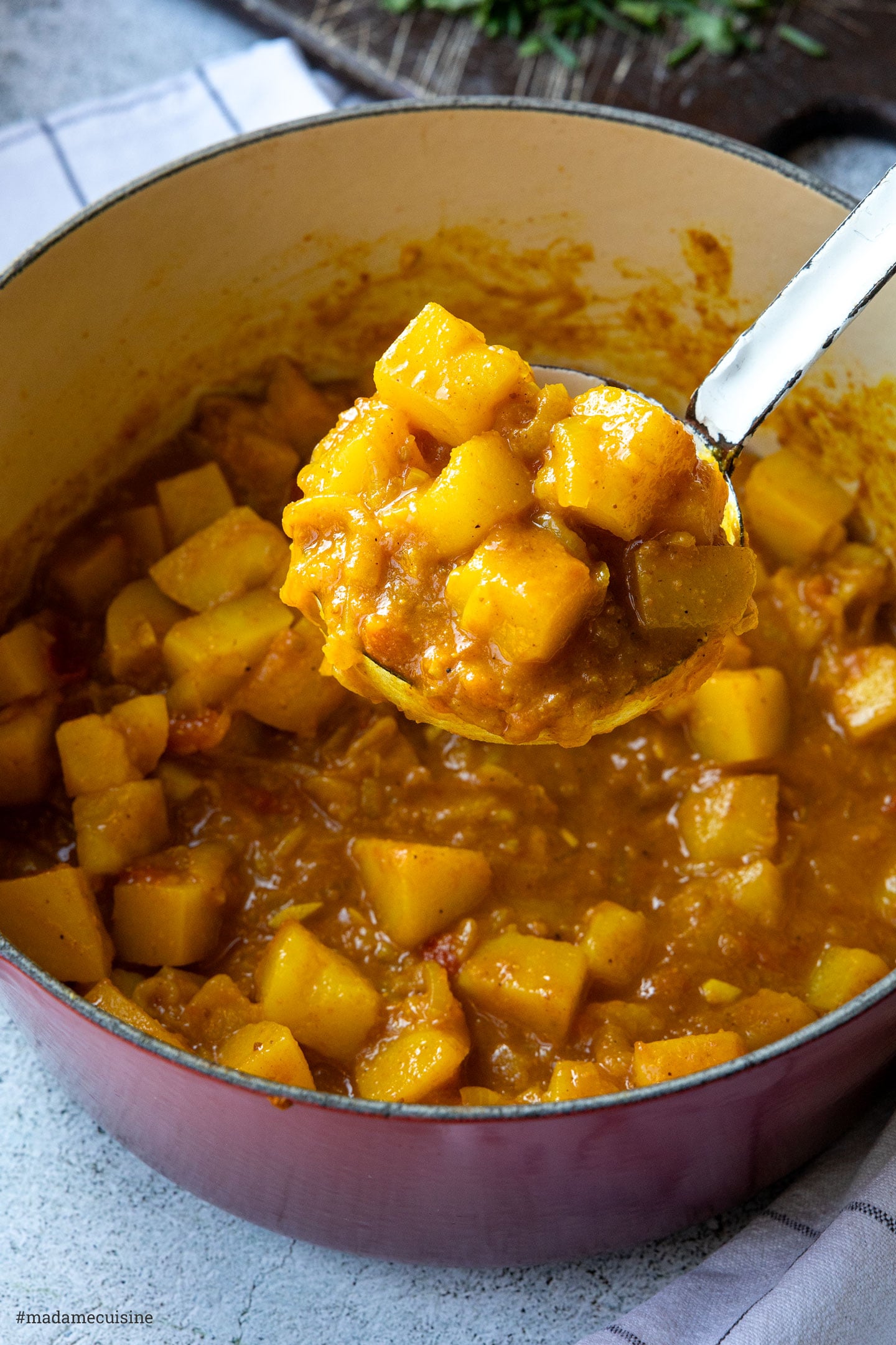 - Kartoffeln dazugeben und vorsichtig mit allen anderen Zutaten vermischen. Mit Salz und Pfeffer würzen und 250 ml Wasser hinzufügen. Bei geschlossenem Deckel und milder Hitze (es darf leicht köcheln) ca. 25 Min. garen, bis die Kartoffeln weich sind. Gelegentlich umrühren und bei Bedarf noch ein klein wenig Wasser hinzufügen. Die Kartoffeln sollen nicht am Boden des Topfes ansetzen, das Curry aber auch nicht zu flüssig werden.