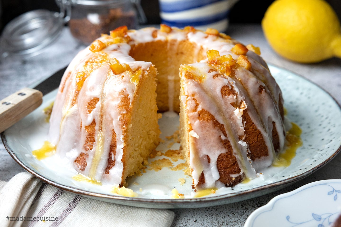 - Den Puderzucker in eine kleine Schüssel geben und mit 2-3 EL Zitronensaft zu einem Guss verrühren. Den Zuckerguss über dem Kuchen verteilen und fest werden lassen. Auf Wunsch zusätzlich mit 1 EL kandierten Zitronen- oder Orangenstücken servieren.