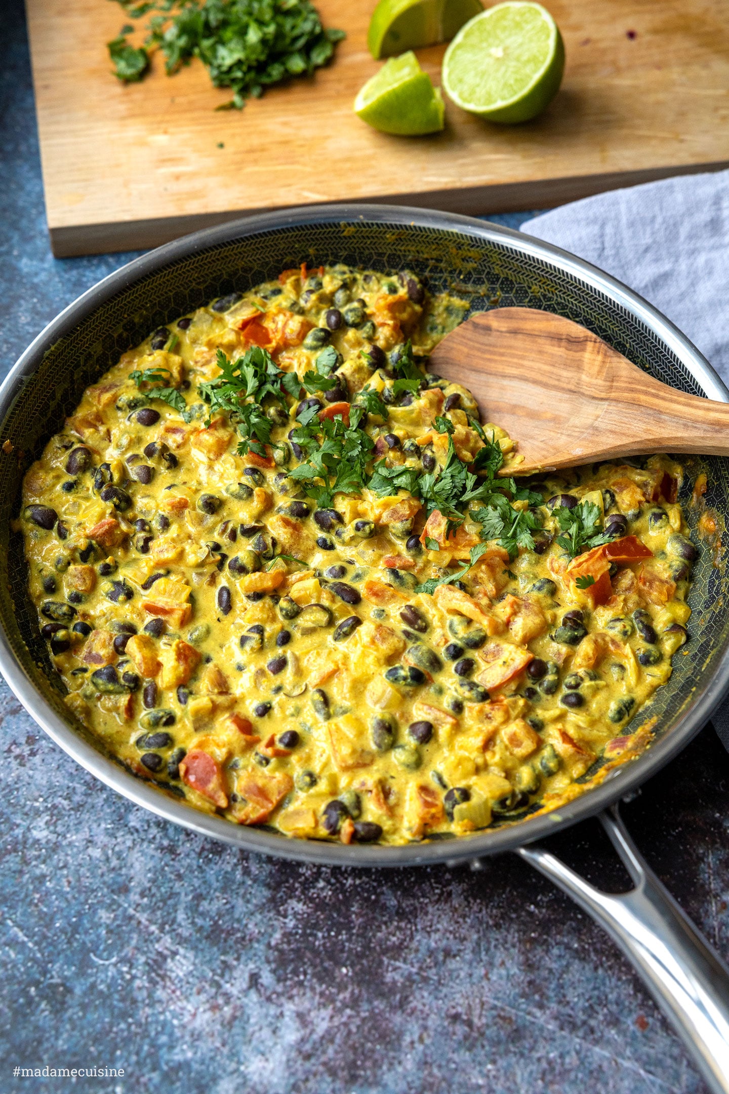 Schwarze Bohnen sind in der lateinamerikanischen Küche seit Jahrhunderten ein Grundnahrungsmittel – und das aus gutem Grund. Sie sind nicht nur vielseitig einsetzbar, sondern auch ausgesprochen nährstoffreich. Pflanzliches Eiweiß, Ballaststoffe, Eisen, Magnesium und Antioxidantien sind hier besonders erwähnenswert. In diesem Schwarze-Bohnen-Curry sorgen sie für eine wunderbar cremige Konsistenz und eine leichte, nussige Note. Gleichzeitig machen sie das Gericht richtig sättigend. Der große Vorteil: schwarze Bohnen - ähnlich wie Kidneybohnen - gibt es mittlerweile in vielen Supermärkten bereits vorgegart in der Dose. Sie müssen vor der Verwendung lediglich abgespült werden und eignen sich somit perfekt für die schnelle Alltagsküche.