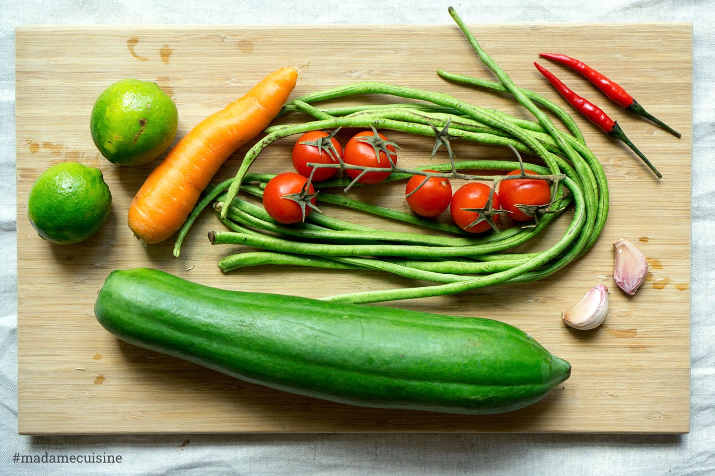 - Vorab: Dies ist ein Rohkost-Salat, auch die Bohnen werden nicht gekocht. Die Zutaten werden im großen Mörser oder einer Schüssel kräftig angedrückt, damit sich die Aromen entfalten. Wer mag, kann die Schlangenbohnen aber zur Sicherheit kurz blanchieren, siehe mein Kommentar im Text oben.