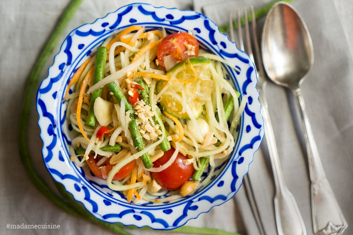 Es ist schon viele Jahre her, dass ich zum ersten Mal in Thailand war. Ich hatte soeben mein Studium abgeschlossen, und war auf einer kleinen Weltreise, bevor mich der Ernst des Lebens erwartete. Ein Teil der Reise führte mich und meinen Begleiter (Schulfreund, Kommilitone, WG-Mitbewohner und mittlerweile auch Trauzeuge) quer durch Thailand. Über Bangkok, Ko Samet, Chang Mai, Ko Tao bis Ko Phi-Phi. Irgendwann, ich glaube es war auf Ko Tao, saßen wir im Restaurant am Strand, und ich fand den Papaya-Salat auf der Karte.