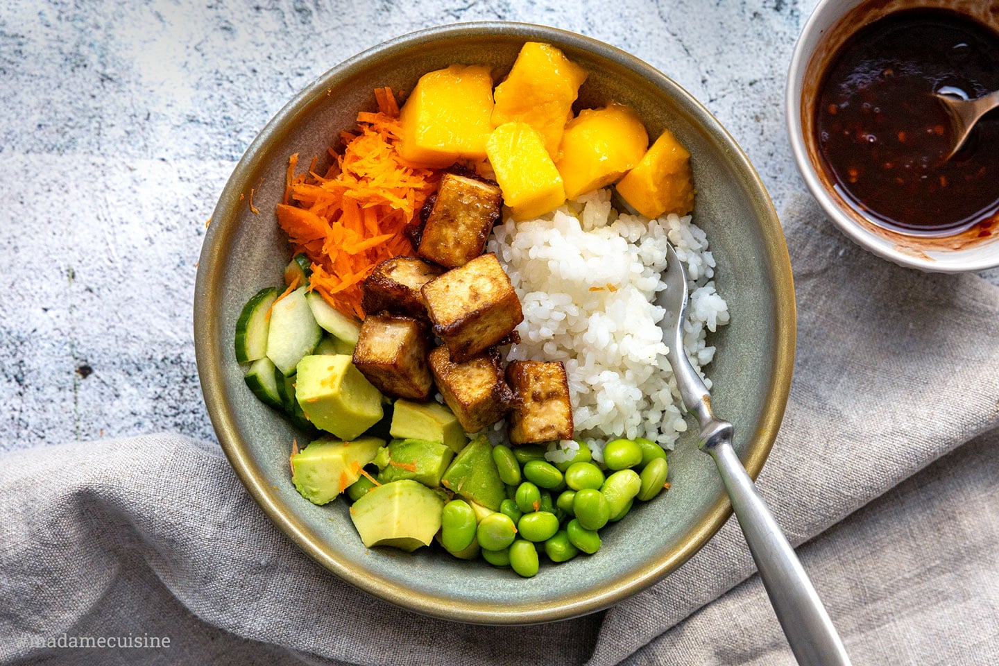 Sushi-Fans aufgepasst! Diese unglaublich leckere und einfach zubereitete Sushi-Bowl ist die perfekte Alternative für alle, die Sushi lieben, aber keine Zeit oder Lust auf mühsames Sushi rollen haben. Einfach Sushireis, Mango, Gemüse und knusprig gebratenen Tofu in eine Schüssel füllen und genießen! Bon Appetit!