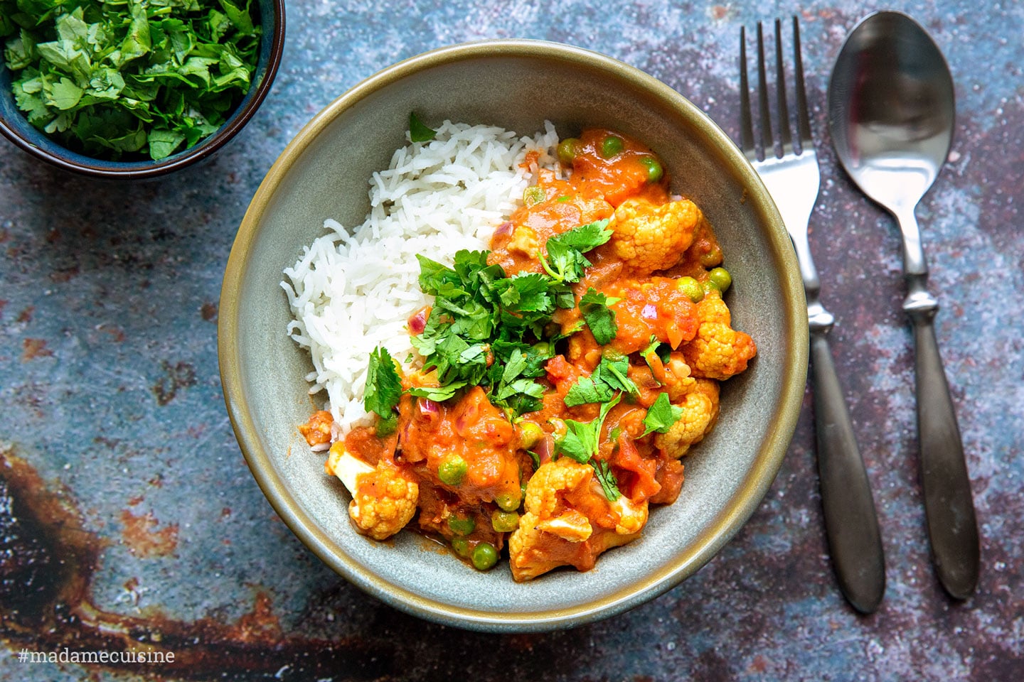 Das Blumenkohl-Korma wird ebenfalls mit Reis und - wer mag - viel frischem Koriander serviert. So ist der Rest der Familie dann auch glücklich. Alle satt, alle zufrieden, und das alles mit wirklich überschaubarem Aufwand. Genial, oder?! 🙂