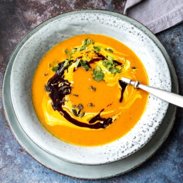 In diesem leckeren und schnell zubereiteten Rezept wird der Kürbis mit Ingwer, Orange, ein wenig Garam Masala sowie Gemüsebrühe schön weich gegart und anschließend zu einem herrlich cremigen Süppchen püriert.